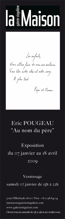 L'écriture appliquée et manuscrite est portée sur du papier à lettres : “Les enfants, nous allons vous enfermer.Vous êtes notre chair et notre sang, À plus tard, Papa et Maman”. La messe est dite. Dans une seconde salle, c'est l'écriture enfantine sur des pages de cahier d'écolier qui prend la parole, une parole silencieuse “J'ai peur, je veux être la peur”, une prière “Mon Dieu, faites que je n'espère plus, Eric”, et ces objets pour lesquels l'on pourrait presque éprouver une forme de nostalgie, si les extrémités de ces trois règles en fer n'étaient pas dangereusement acérées, et la chemise d'écolier consciencieusement suspendue sur un cintre avec Éric Pougeau amoureusement brodé, une camisole taille 6 ans. Les œuvres d'Éric Pougeau, écritures et objets, abordent sans complaisance par l'entremise de la famille et de la religion, la mort, la violence, la morale, avec une insolence radicale, avec humour, économie, et d'une certaine manière pureté. J'entends ici pureté de la forme, l'artiste ne fait pas le jeu de l'image choc ou sanglante, les médias remplissent fort bien cet office. Dans ses différents travaux d'écriture, la violence est entièrement contenue dans le pouvoir des mots, nous ne sommes pas dans un art de l'outrance ou de la vulgarité, nous devenons le témoin d'échanges secrets entre parents et enfants, entre l'enfant et lui-même, sans considération morale, sans parti pris, ni jugement. |