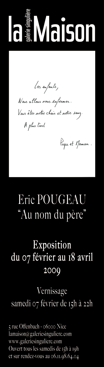 Consacrer une exposition personnelle à l'artiste Éric Pougeau à la Maison n'est pas anodin. Outre le caractère monographique communément entendu, il s'agit de convoquer dans un espace d'exposition singulier, un appartement, le rapport complexe qu'entretient l'artiste dans son travail artistique à l'intime, à la sphère personnelle comme lieu pour questionner, parler et critiquer des systèmes de pouvoir, d'autorité, d'enfermement, de manipulation et d'abandon, ainsi que notre propension à digérer la violence, qu'elle soit morale, institutionnelle ou médiatique. Dans l'exposition “Au nom du père” point de couronnes et de plaques mortuaires aux inscriptions lapidaires, mais un glissement des signes et des rituels religieux (la confession, la prière, le rapport à la chair et au sang) vers la cellule familiale tout en préservant l'imbrication de ces deux entités à travers les travaux d'écriture de l'artiste qui transcendent (transgressent) les liens du sang, le rapport au corps et à l'esprit de famille conventionnel. Le “Nom du père” implique le fils, cet enfant fictif prenant la plume, le petit Éric Pougeau. mais aussi “Les enfants”, l'œuvre centrale de l'exposition. “Le nom du père”, enfin, est une expression utilisée en 1951 par Jacques Lacan pour désigner un concept psychanalytique sur les psychoses infantiles, où le “nom” renvoie spécifiquement au langage et à l'inscription de l'être dans le réel. L’“Hôpital Marquis de Sade” fantasmé par l'artiste dans une œuvre de 2004 n'est plus très loin. Depuis “Ne me cherchez pas je suis mort” (2004), Éric Pougeau a fait de l'écriture son matériau, la chair de ses fictions dont il a réuni pour l'exposition à la Maison, les plus récentes et les plus importantes. La série de 33 mots “Les enfants”, présentée dans “le salon”, recense un corpus de petits mots que les parents laissent habituellement à leurs enfants sur la table de la cuisine. |